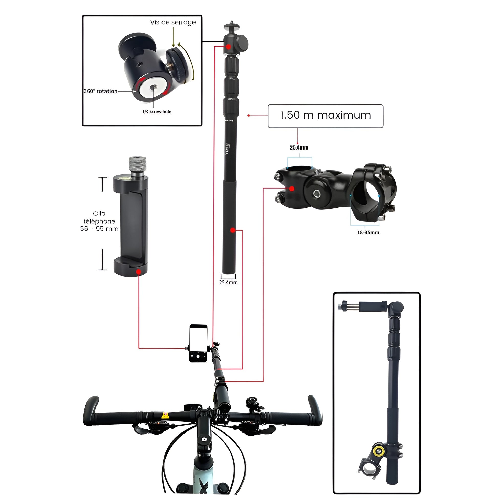 - S'adapte à tous les guidons (vis allongées + caoutchouc fournis)